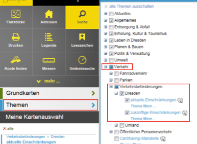→ Themen → Verkehr → Verkehrsbehinderungen→ Dresden → aktuelle/zukünftige Einschränkungen.